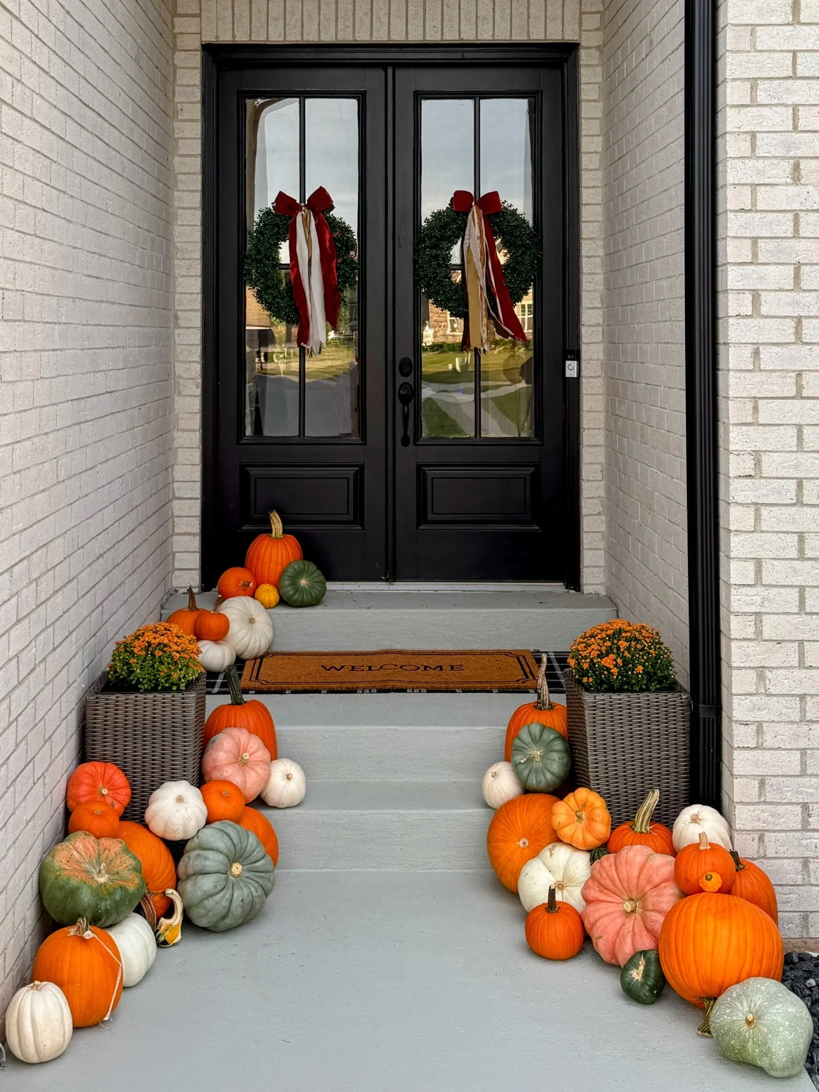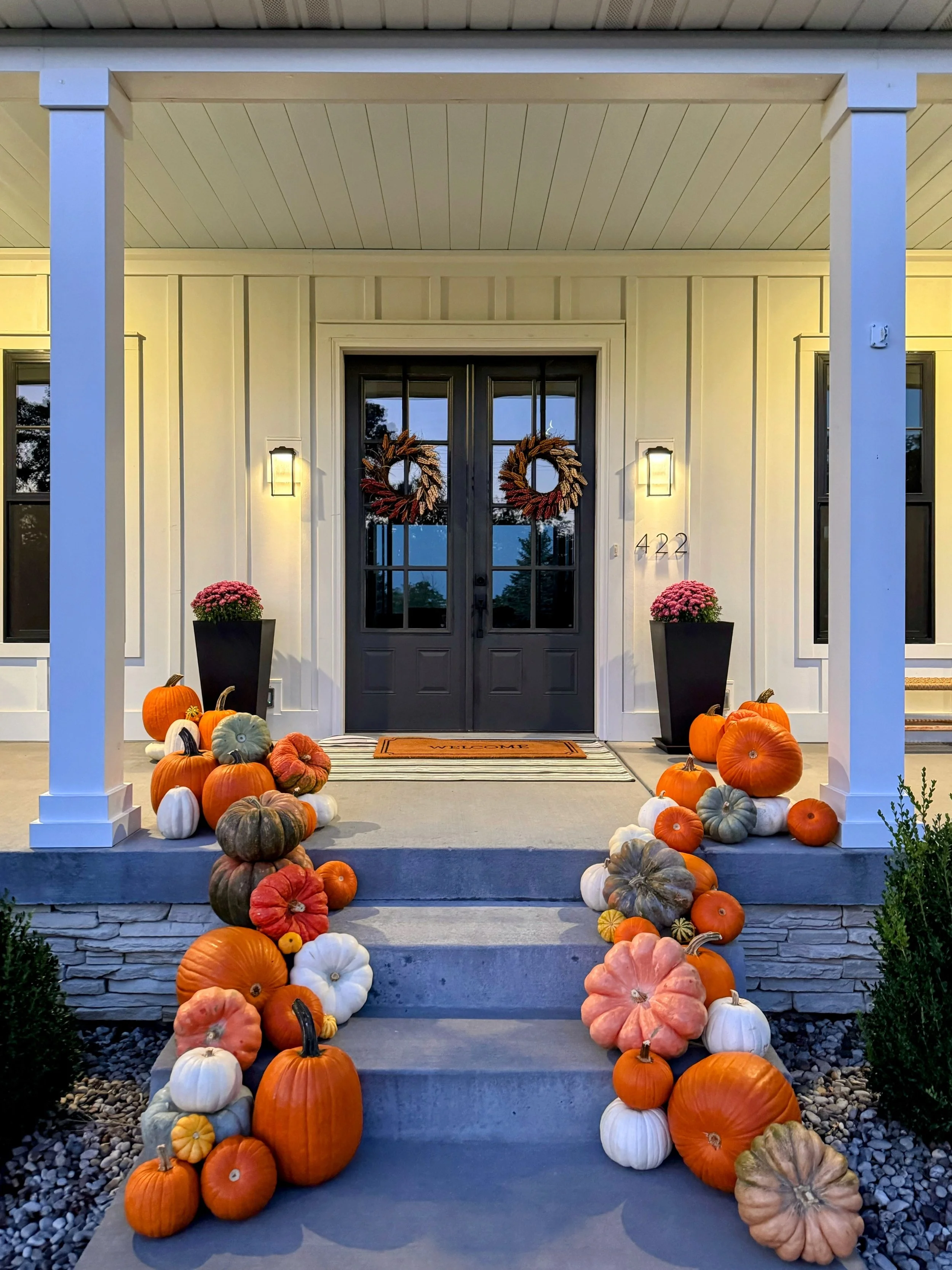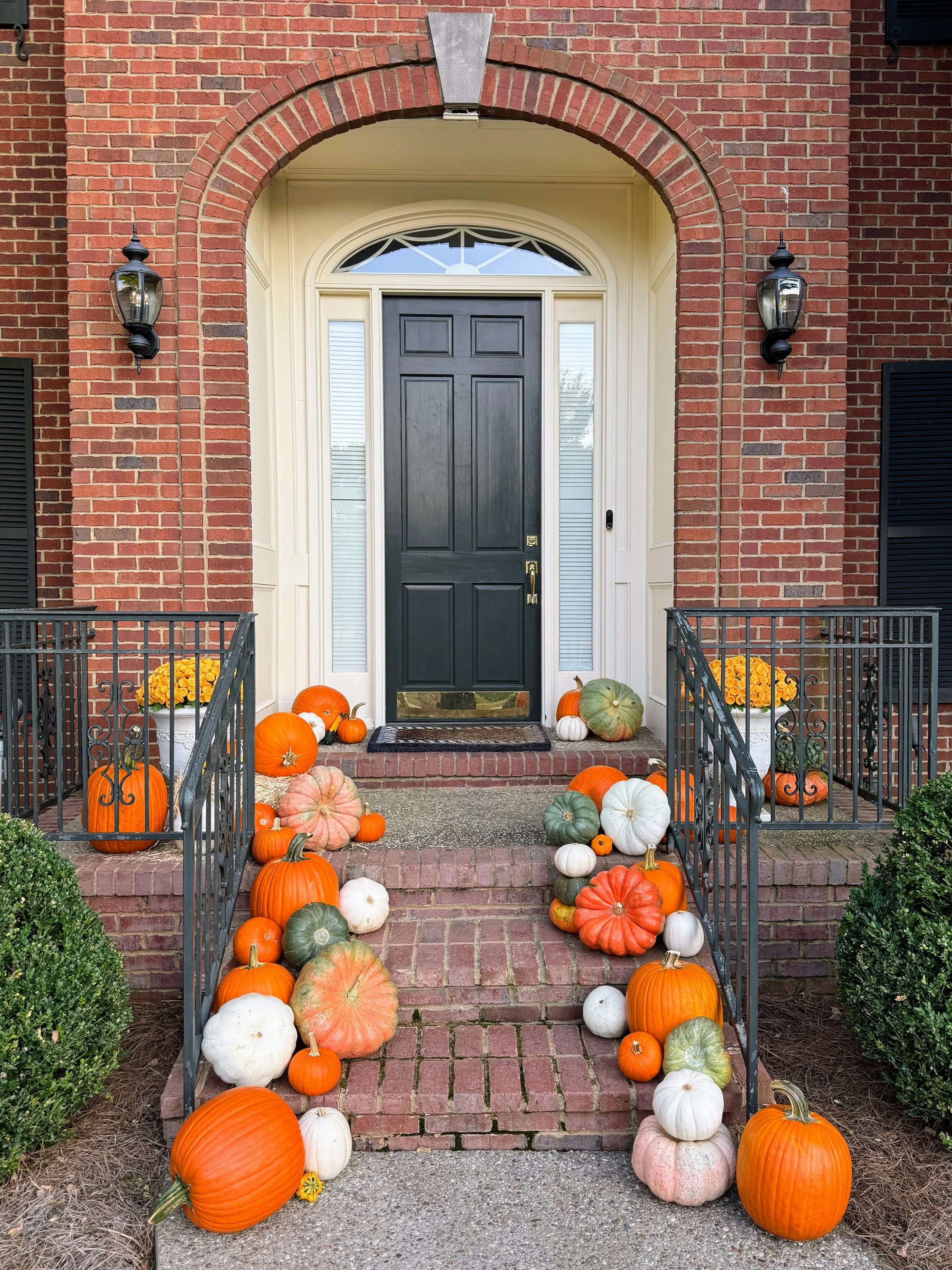 The wonderful thing about decorating your front porch with pumpkins is that your outdoor decorations for two holidays are covered, Halloween and Thanksgiving! Plus they make an amazing spot for fall family photos.